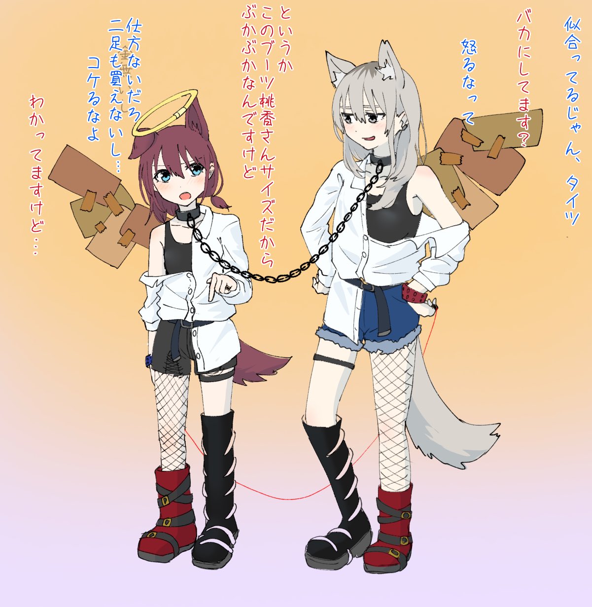 2girlsanimal ear fluffanimal earsasymmetrical footwearasymmetrical legwearblack bootsblack shortsblack tank topblue eyesblue shortsblushbootsbraceletbrown hairdog earsdog girldog tailfake halofake wingsfishnet pantyhosefishnetsgradient backgroundgrey eyesgrey hairhair between eyeshalojewelrykemonomimi modelong hairlow twintailsmismatched footwearmismatched legwearmulticolored hairmultiple girlsopen mouthpantyhosered bootsringroots (hair)shirtshort hairshort twintailsshortssingle leg pantyhosestringstring of fatetailtank toptwintailswhite shirtwings