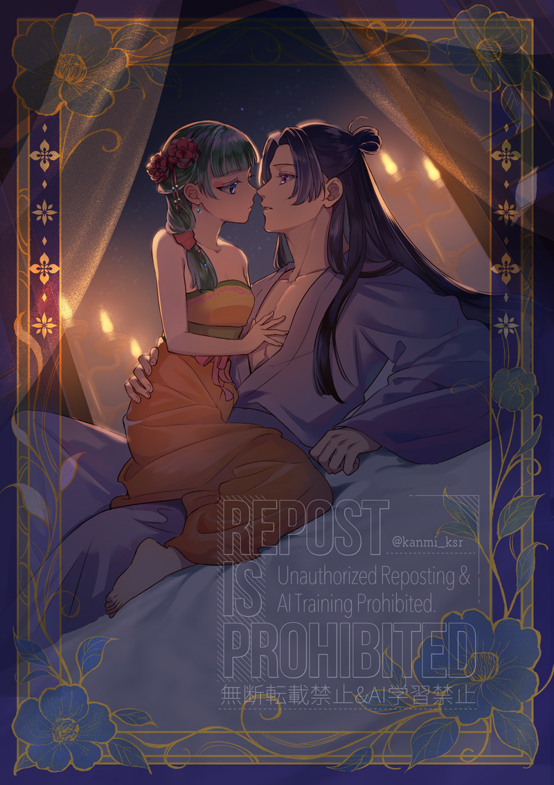 1boy1girlarm around waistbare armsbare shouldersbarefootblue eyesblunt bangsbreastscouplecurtainsdressearringsflowergreen hairhair bunhair flowerhair ornamenthair over one eyehalf updohand on another's chestheteroimminent kissjewelrykanmi ksrlong dresslong hairlooking at anotherorange dressparted bangsparted lipspink eyespurple hairpurple robered flowerrobesmall breastsstraplessstrapless dresstwitter usernamewatermark