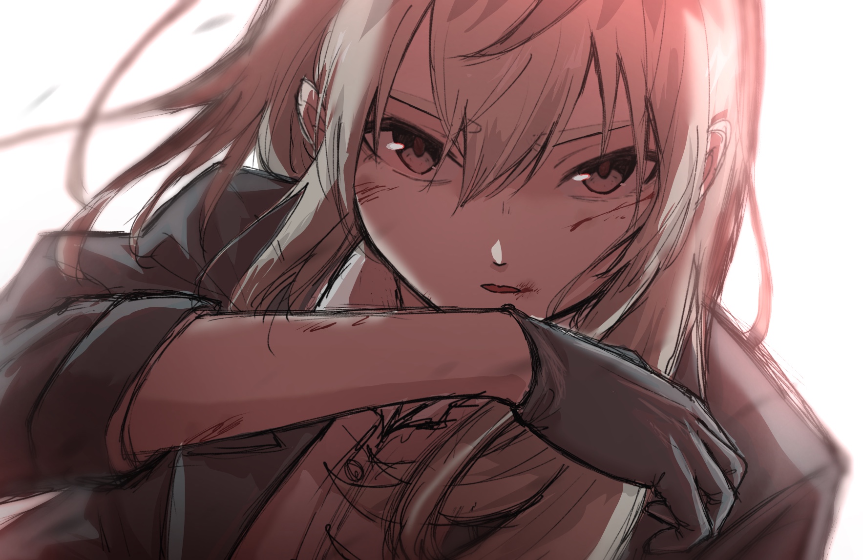 1girlblack glovesblack jacketbloodblood on facecollared shirtdress shirtglovesgrey eyesgrey hairhair between eyesinjuryjacketmulticolored hairopen mouthroots (hair)shirtsimple backgroundsoloupper bodywhite backgroundwhite shirt