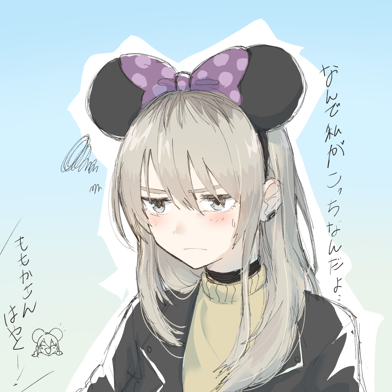 ellygretta, yae miko, genshin impact, commentary, english commentary, highres, 1girl, animal ear piercing, animal ears, bare shoulders, blurry, branch, cherry blossoms, depth of field, floppy ears, fox ears, fox girl, hair between eyes, hands up, long hair, looking at viewer, nail polish, own hands together, parted lips, pink hair, portrait, purple eyes, red nails, shirt, sleeveless, sleeveless shirt, smile, solo, white background, white shirt