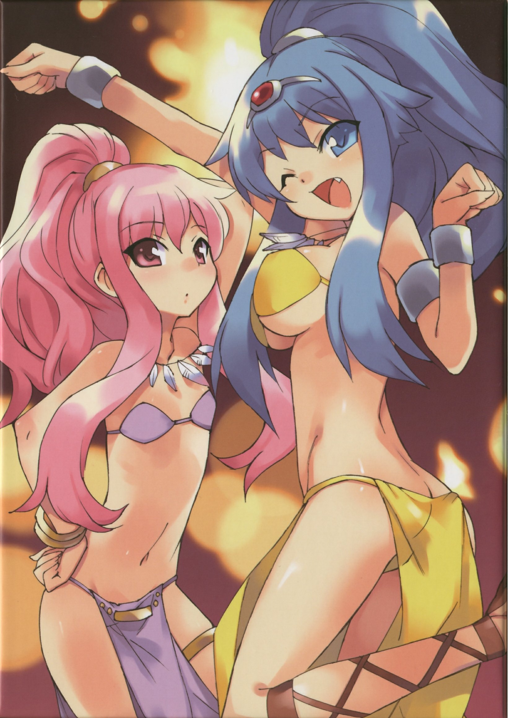 00s2girlsassbikinibreastsdancerfangflat chestgreen eyesjewelrylarge breastsloinclothlong hairlong legslots of jewelrymultiple girlsone eye closedpink eyespink hairswimsuitwink