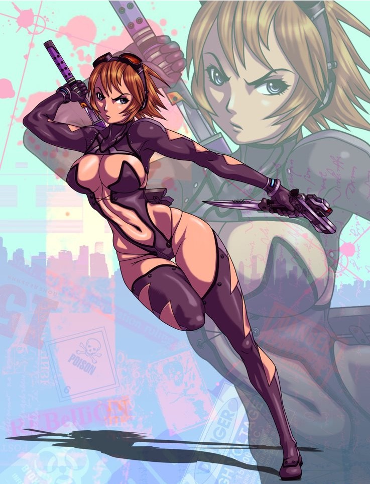 angryblack eyesblue eyesbreastsbrown haircleavagegogglesgunknifelarge breastsnavelninjaorange hairringed eyesshadowsheathshort hairsoloswordthick thighsthighsunsheathingweaponwide hipszoom layer