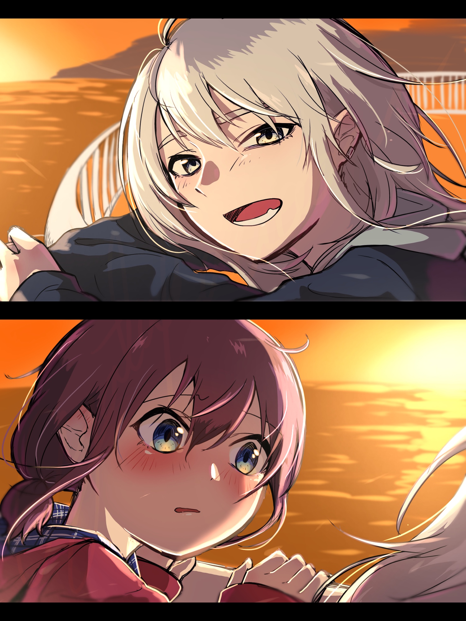 um 111, koyuki (blue archive), yuuka (blue archive), blue archive, absurdres, highres, 2girls, black halo, blue necktie, halo, indoors, long hair, multiple girls, necktie, open mouth, penetration gesture, pink eyes, pink hair, purple eyes, purple hair, twintails