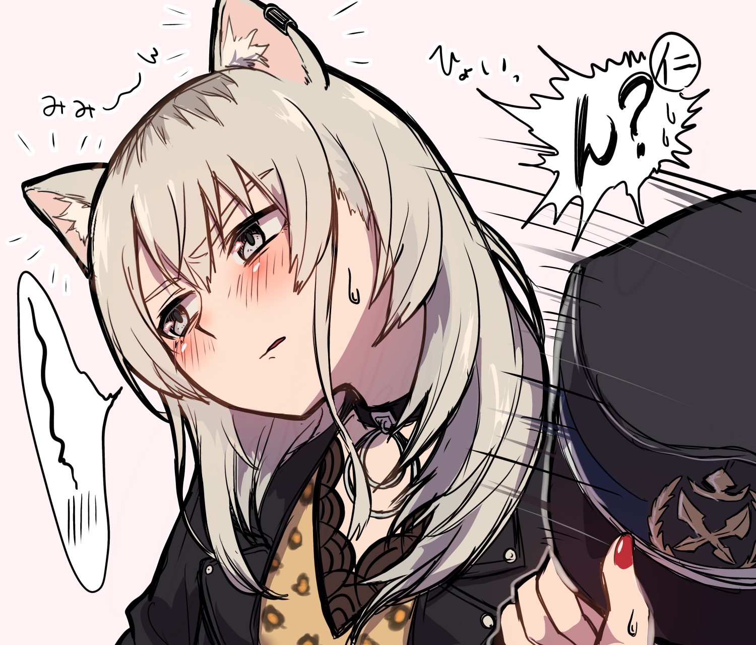 2girlsanimal ear fluffanimal ear piercinganimal earsblack chokerblack hatblushcat earschokergrey eyesgrey hairhatkemonomimi modemulticolored hairmultiple girlsopen mouthred nailsroots (hair)simple backgroundsolo focuswhite background