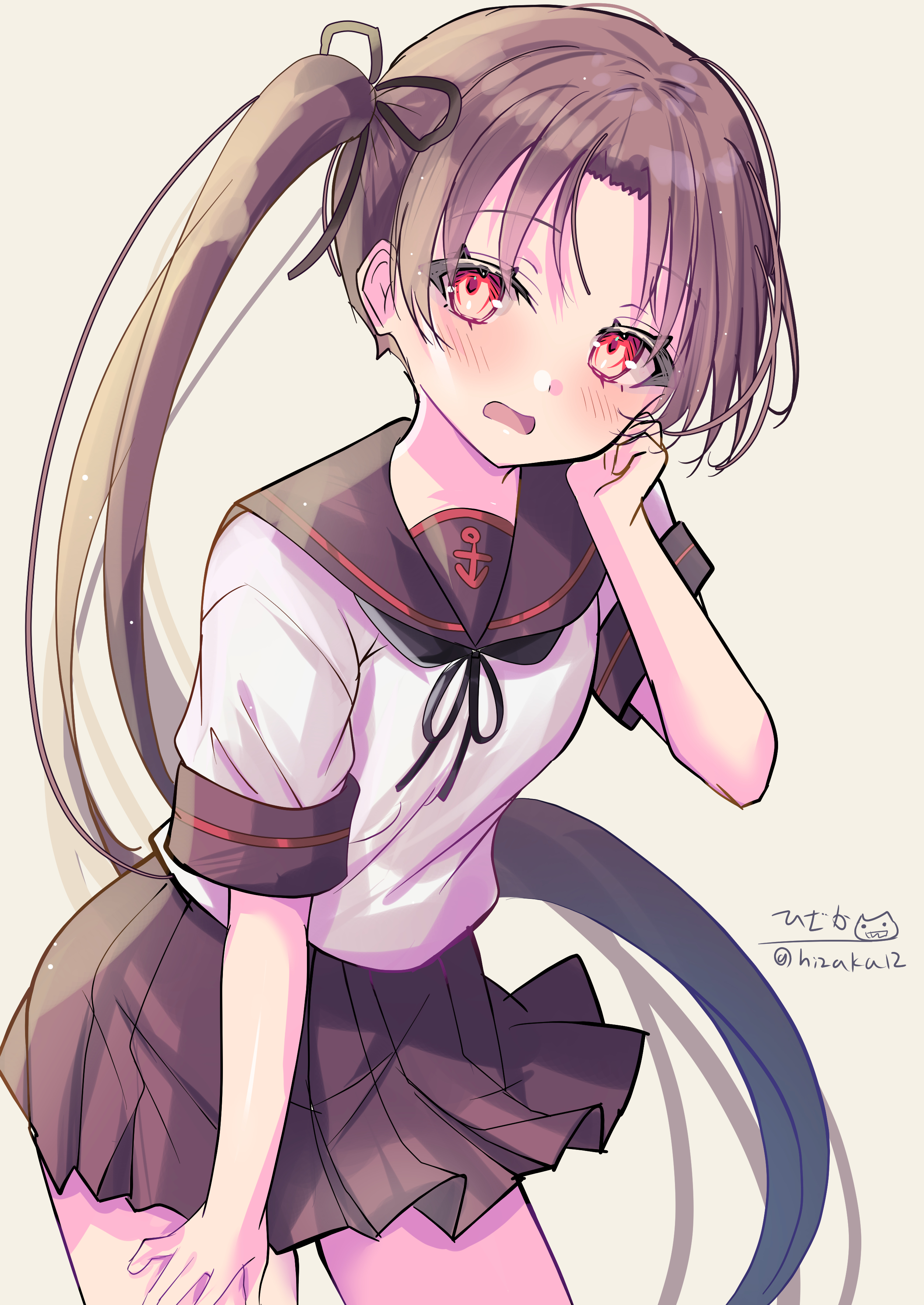 1girlblack sailor collarblack skirtblushbrown backgroundbrown eyesbrown haircowboy shothair ribbonlong hairlooking at viewerone-hour drawing challengeopen mouthpleated skirtponytailribbonsailor collarschool uniformserafukushort sleevesside ponytailsignatureskirtsmilesolotwitter usernamevery long hair
