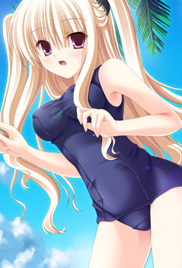 1girlblonde hairblue one-piece swimsuitblue school swimsuitbreastscovered erect nipplesfemale focusimpossible clothesimpossible swimsuitlarge breastsmolemole under eyeone-piece swimsuitopen mouthpurple eyesschool swimsuitshirtsoloswimsuittaut clothestaut shirttwintailstwo side up