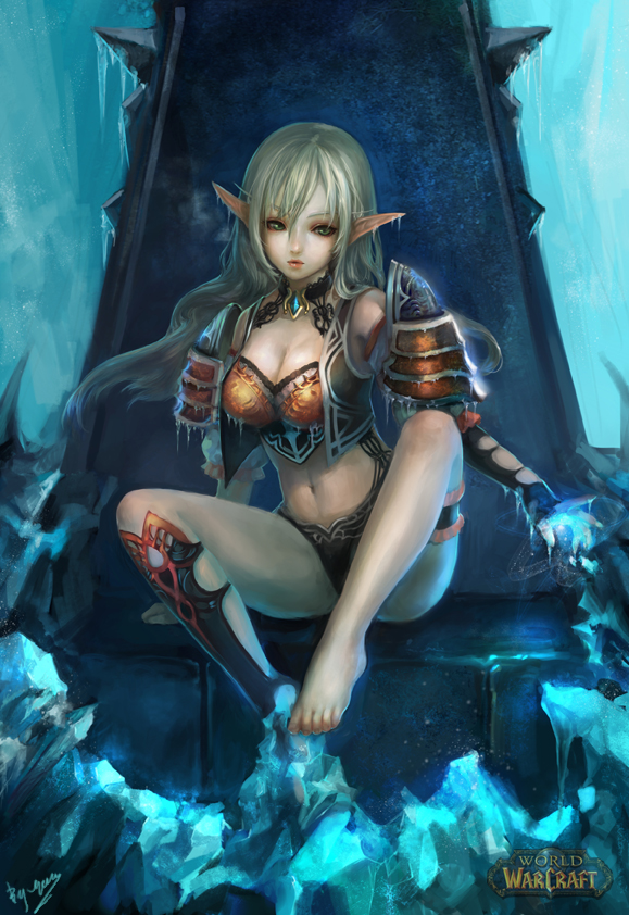 1girlbarefootbreastscleavagecopyright nameelffeetfemale focusicelong hairmedium breastspointy earssolothrone