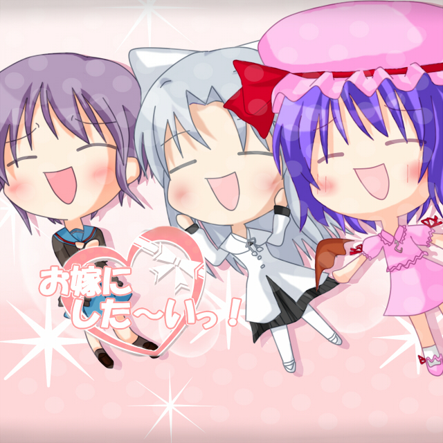 3girlsblushbowchibicrossoverhair bowhatheartlong hairmultiple girlspantyhoseparodypurple hairshort hairwhite hairwings