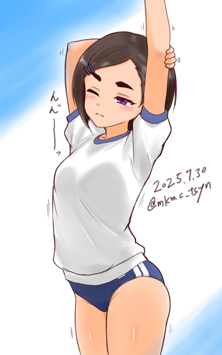 1girlarm upblue burumaburumacowboy shotdatedgym shirtgym uniformone eye closedpurple eyesshirtshort hairsolostandingstretchingt-shirtthick eyebrowstwitter usernamewhite shirt
