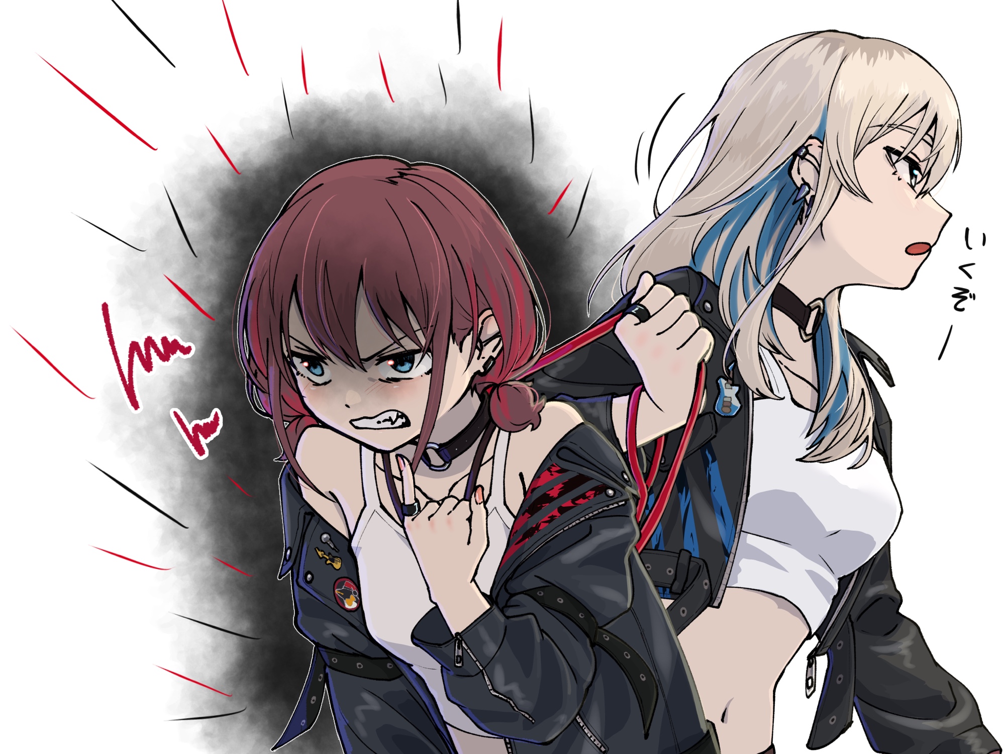 shion (hundred line), sumino takumi, the hundred line -last defense academy-, chinese commentary, commentary request, highres, 2boys, alternate costume, black dress, black hair, black sleeves, black thighhighs, black veil, blue jacket, closed eyes, crossdressing, crossdressing (mtf), detached sleeves, dress, eyes visible through hair, grey jacket, hair over one eye, heterochromia, hood, hood down, hooded jacket, huaxiaoshenhan, hug, jacket, long sleeves, male focus, multicolored hair, multicolored jacket, multiple boys, nun, purple eyes, red hair, short hair, streaked hair, thighhighs, trap, two-tone hair, two-tone jacket, veil, white eyes