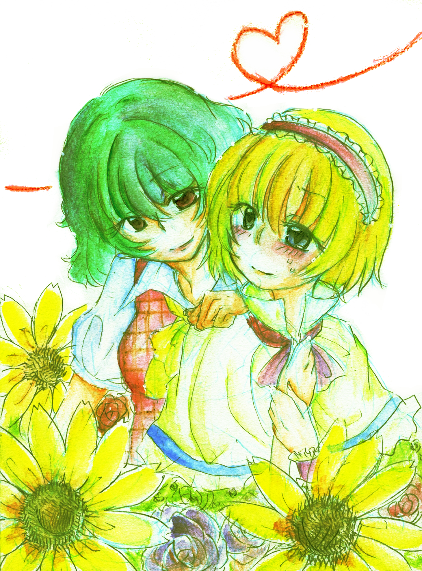 2girlsarm on another's shoulderblonde hairblushfemale focusflowergreen hairheartheart of stringhugmultiple girlsplaid clothesplaid vestsmilevestyuri