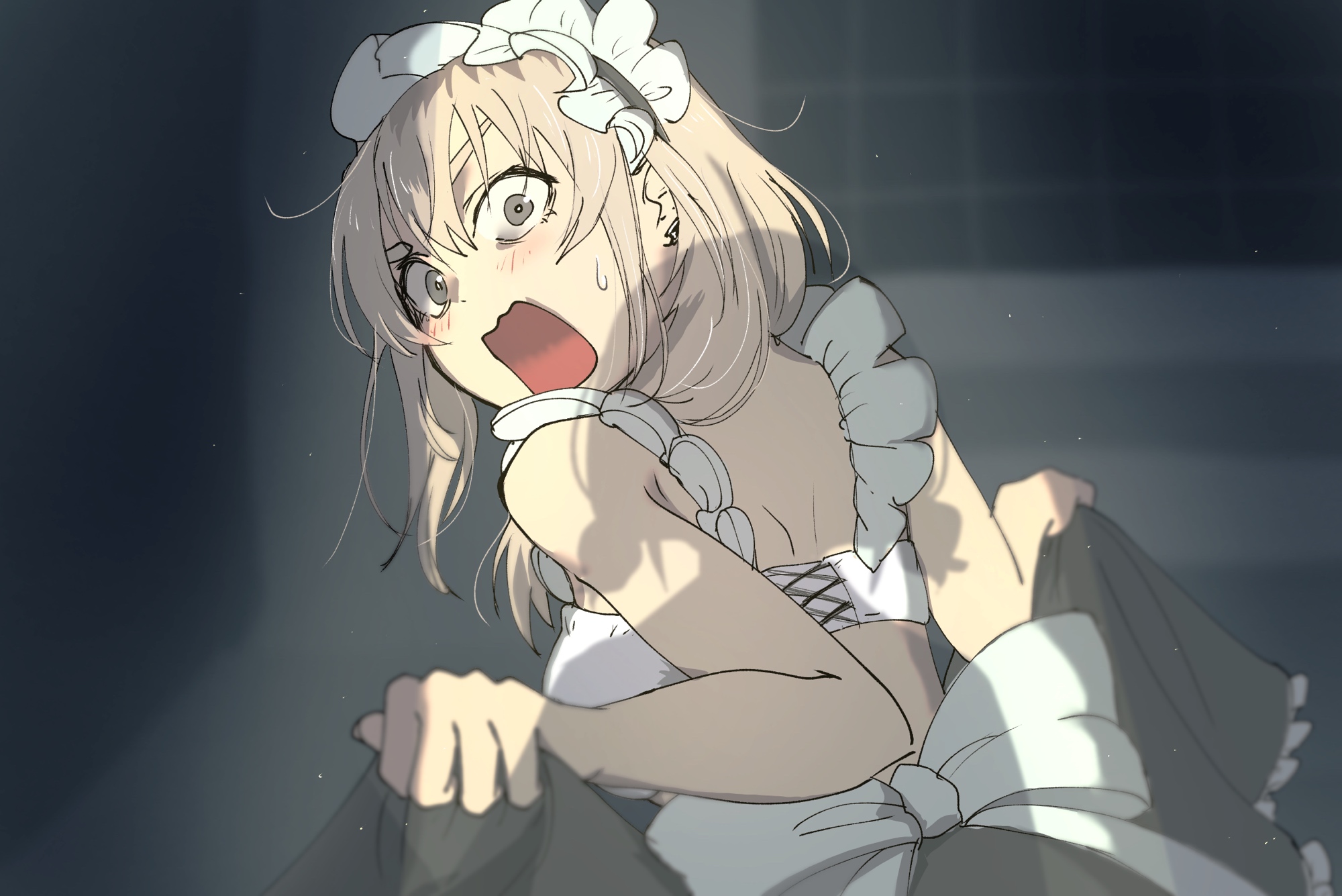 1girlback bowblack dressblushbowbracaughtdressgrey eyesgrey hairlong hairmaidmaid daymaid headdressopen mouthsolosweatdropunderwearwhite bowwhite bra