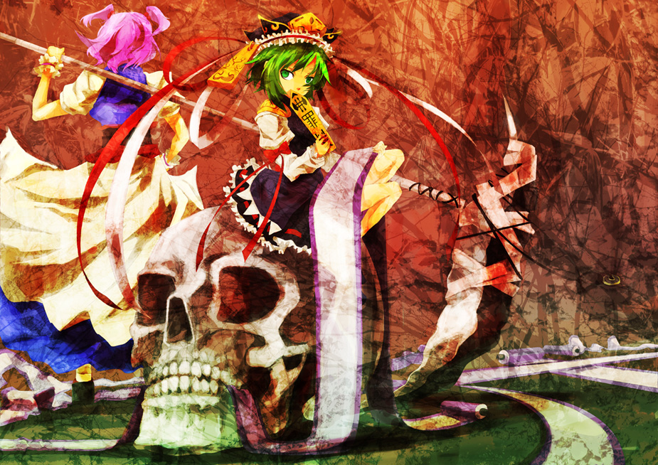 2girlsalternate weaponfemale focusgreen eyesgreen hairhatmultiple girlsrod of remorsescrollscythesittingskullweapon
