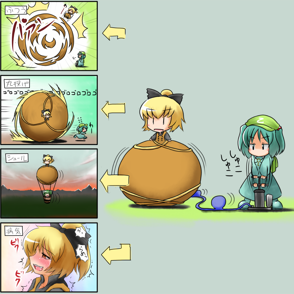 1boy3girls4komaair pumpballoonbicycle pumpblonde hairblushblush stickersbowbucketchibiclosed eyescomicexplosionfemale focusfloatinggreen hairhair bowhathosein bucketin containerinflationmountainmultiple girlsorgasmpumprollingtwo side upuncommon stimulation