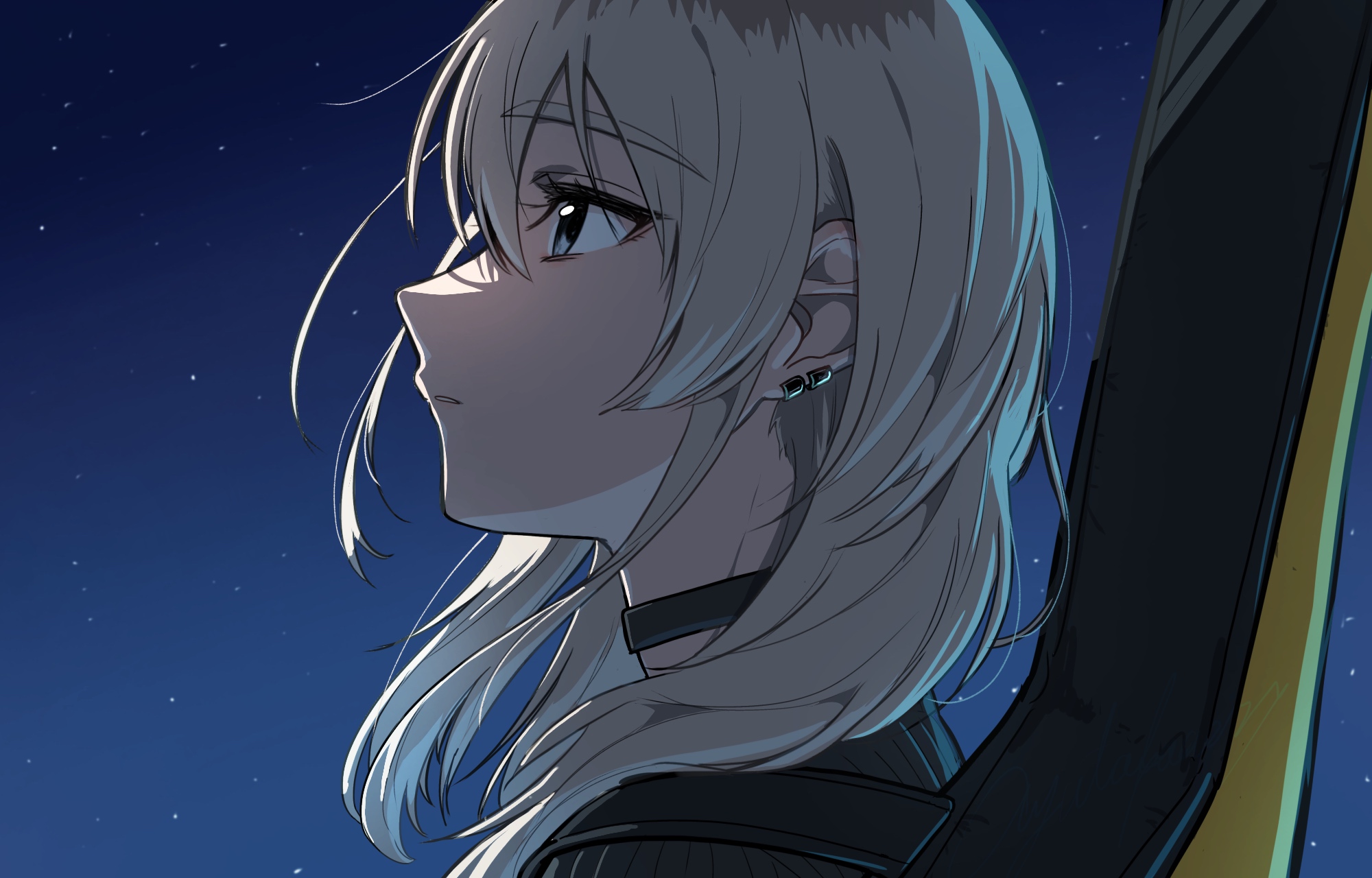 1girlblack chokerchokerearclipgrey eyesgrey hairguitar casehair between eyesinstrument caseinstrument on backlong hairmulticolored hairparted lipsprofileroots (hair)skysolostar (sky)starry skyupper body