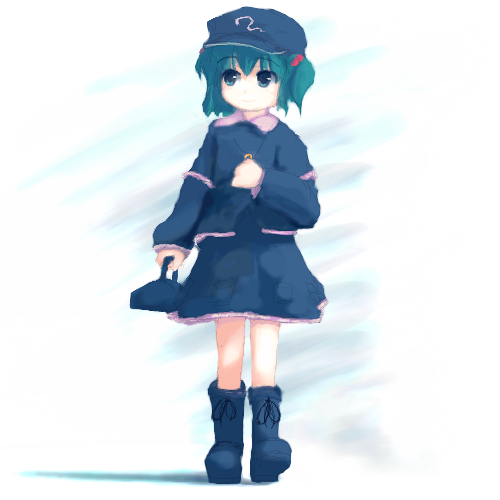 1girlblue dressbootsdressfemale focusflat capfull bodygreen eyesgreen hairhair bobbleshair ornamenthatlong sleevesmatching hair/eyesrubber bootssimple backgroundsolostandingtwo side upwhite background