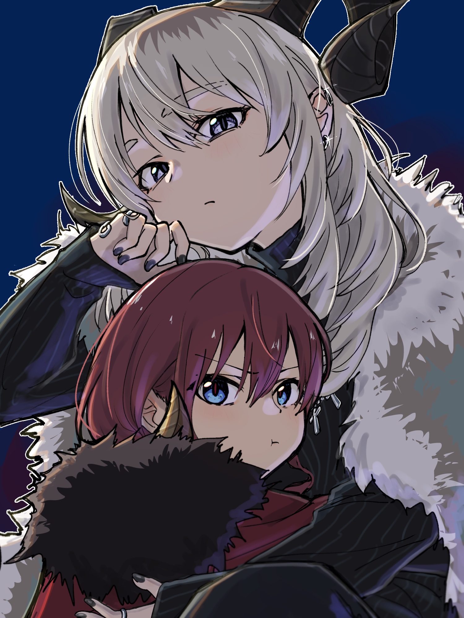 2girlsblack nailsblack sweaterblue backgroundblue eyesbrown hairclosed mouthearclipearringsglintgrey eyesgrey hairhornshugjewelrylong hairlooking at viewermulticolored hairmultiple girlsnail polishpoutroots (hair)short hairsidelockssimple backgroundsweaterupper bodyyuri