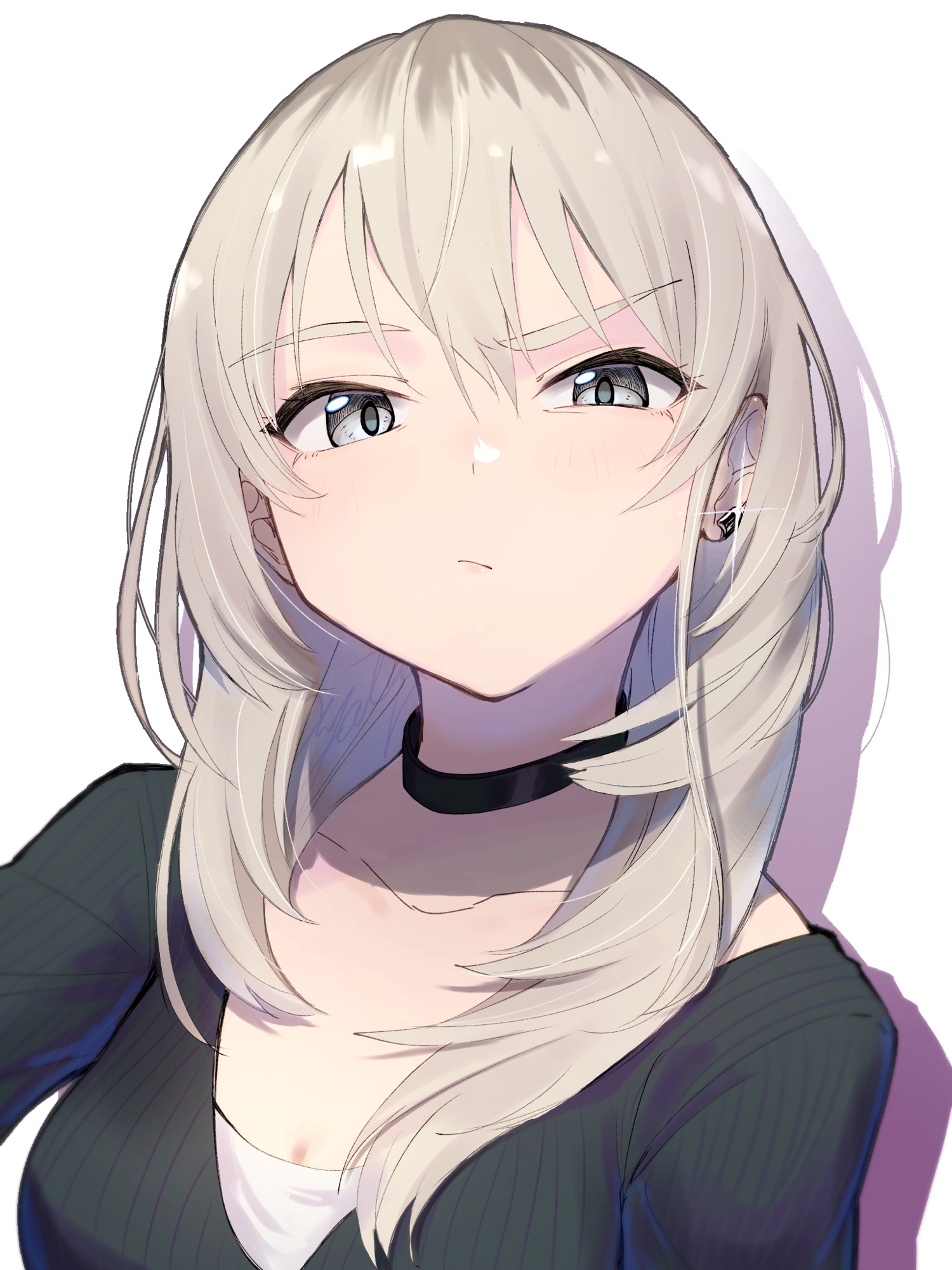 1girlblack chokerblack sweaterbreastschokercleavageclosed mouthearclipglintgrey eyesgrey hairhair between eyeslooking at viewermedium breastsmulticolored hairroots (hair)shadowsimple backgroundsolosweaterupper bodywhite background