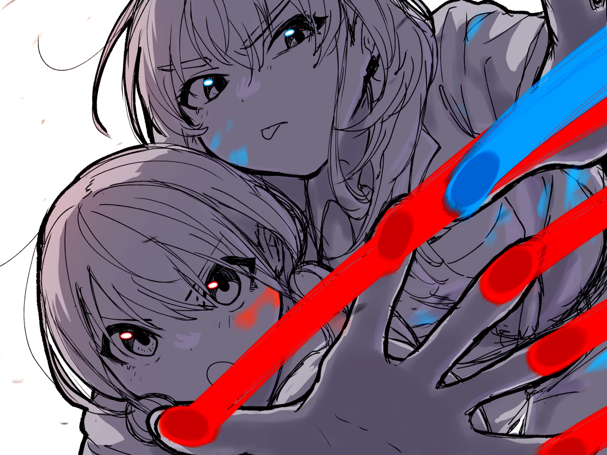 shihouin yoruichi, sui-feng, bleach, artist request, highres, 00s, 1futa, 1girl, bad anatomy, blush, breasts, cum, cum on body, cum on breasts, cum on upper body, dark-skinned female, dark skin, ejaculation, flat chest, futa with female, futanari, grabbing another's breast, greyscale, groping, hand on another's head, holding, huge breasts, interracial, monochrome, multiple girls, nipples, nude, one eye closed, open mouth, paizuri, penis, ponytail, projectile cum, short hair with long locks, sweat, twintails, wink