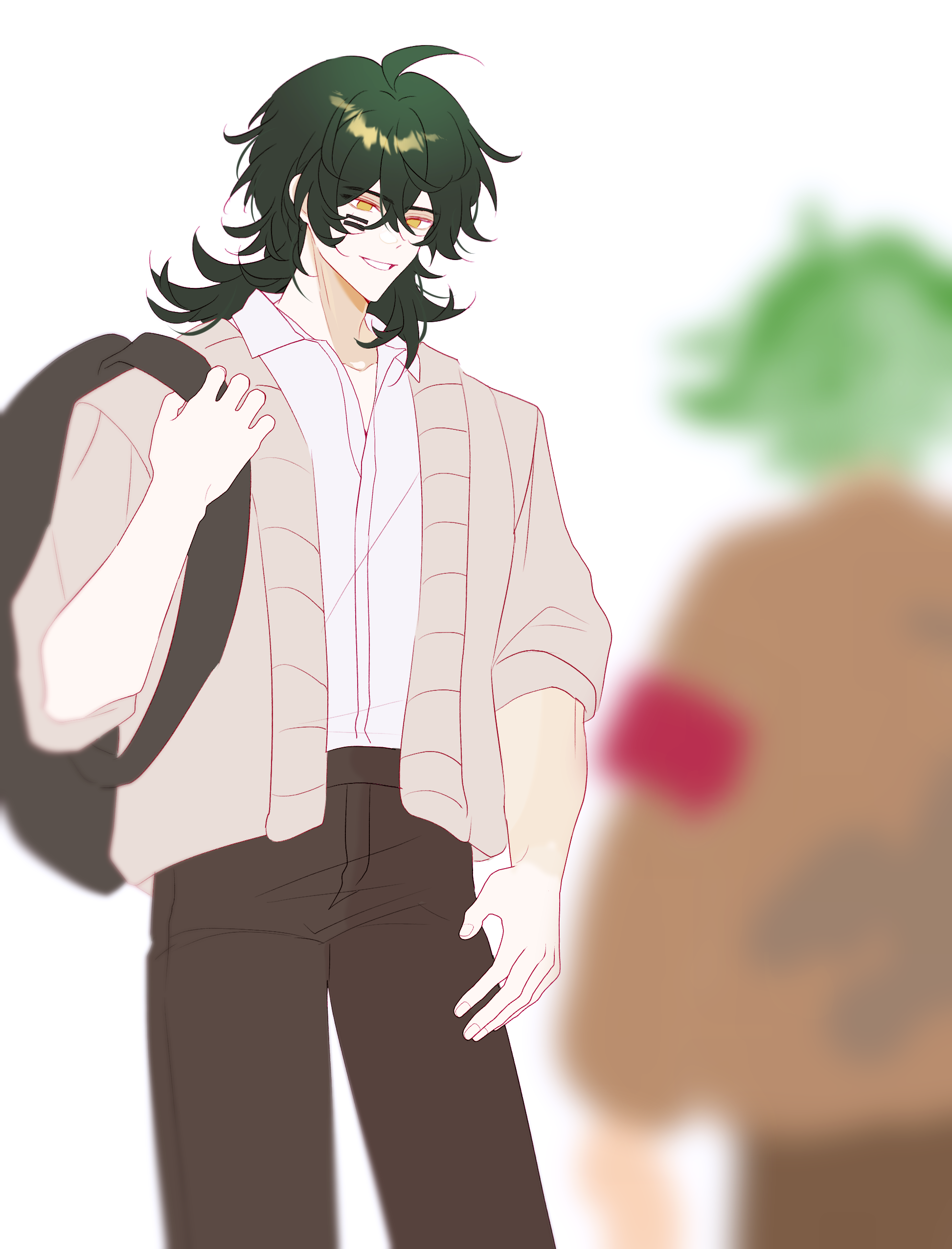 :d2boysahogearmbandbackpackbagblack bagblurryblurry backgroundbrown pantscardigancheek tattoocollared shirtcowboy shotcrossed bangsdepth of fielddouble-parted bangsflipped hairgreen hairgrey cardigangrinhair between eyeshand upholdingholding baglong sleeveslooking at anothermale focusmedium hairmultiple boysno pupilsopen cardiganopen clothesopen mouthpantspersonificationred armbandschool uniformshirtshirt tucked insimple backgroundsmilesolo focusstandingtattoothree-quarter sleeveswhite backgroundwhite shirtyellow eyes