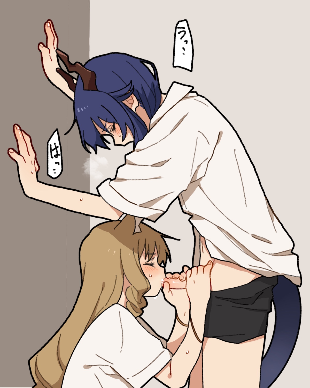 2girlsblack shortsblue hairblushbrown hairclosed eyesdragon girldragon hornsdragon tailfellatiofuta with femalefutanarihornslong hairmultiple girlsoralpenisshirtshortssidelockstailwhite shirt