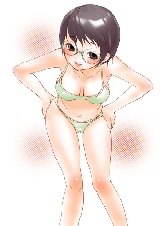 black hairblushbrabrown eyesglassesgreen bragreen pantieslegslingeriemidriffnavelpantiesshort hairsmilesolostomachunderwearunderwear only