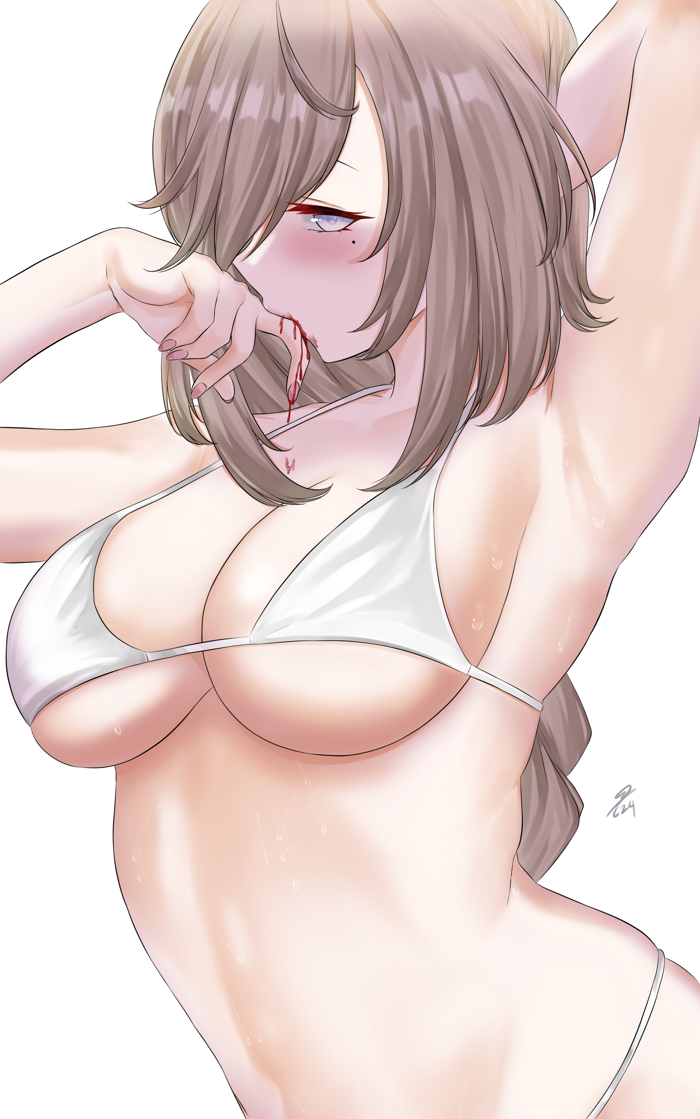 1girlarm behind headarmpitsbikinibiting own fingerbloodblue eyesbreastsbrown hairlarge breastslong braidlong hairmolemole under eyesimple backgroundsolostomachswimsuitvery long hairwhite backgroundwhite bikini