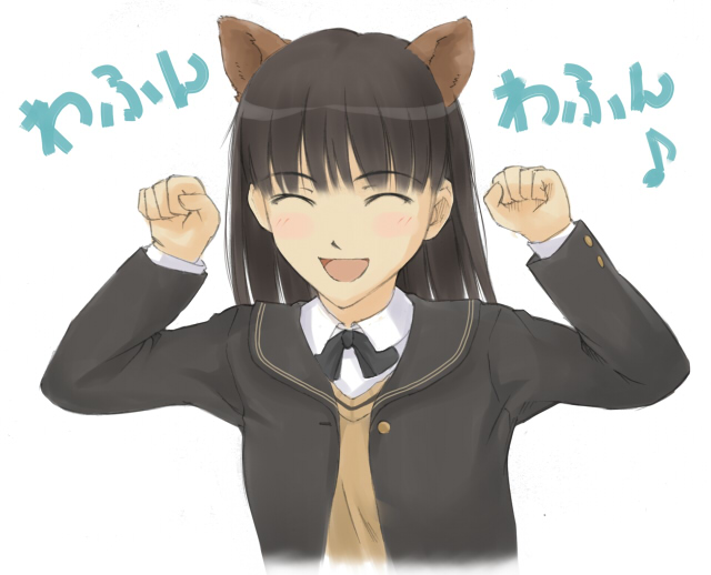 animal earsarms upblack hairblazerblushcaramelldansencat earsclosed eyesjacketmusical noteschool uniformshort hairsmilesolosweater vestvest