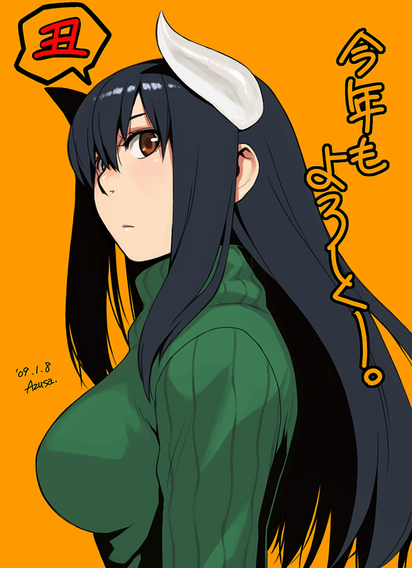 1girlblack hairbreastsbrown eyesfemale focusgreen shirthornslarge breastslong hairshirtsimple backgroundsolosweaterturtleneck