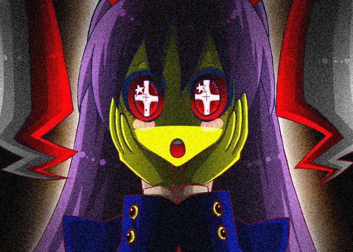 lizrin, alucard lore, emil chronicle online, 1girl, ahoge, alternate costume, black bow, black ribbon, black shirt, bow, character name, cross hair ornament, frilled bow, frills, hair bow, hair ornament, long hair, neck ribbon, purple eyes, purple hair, ribbon, sailor collar, shirt, solo, twintails