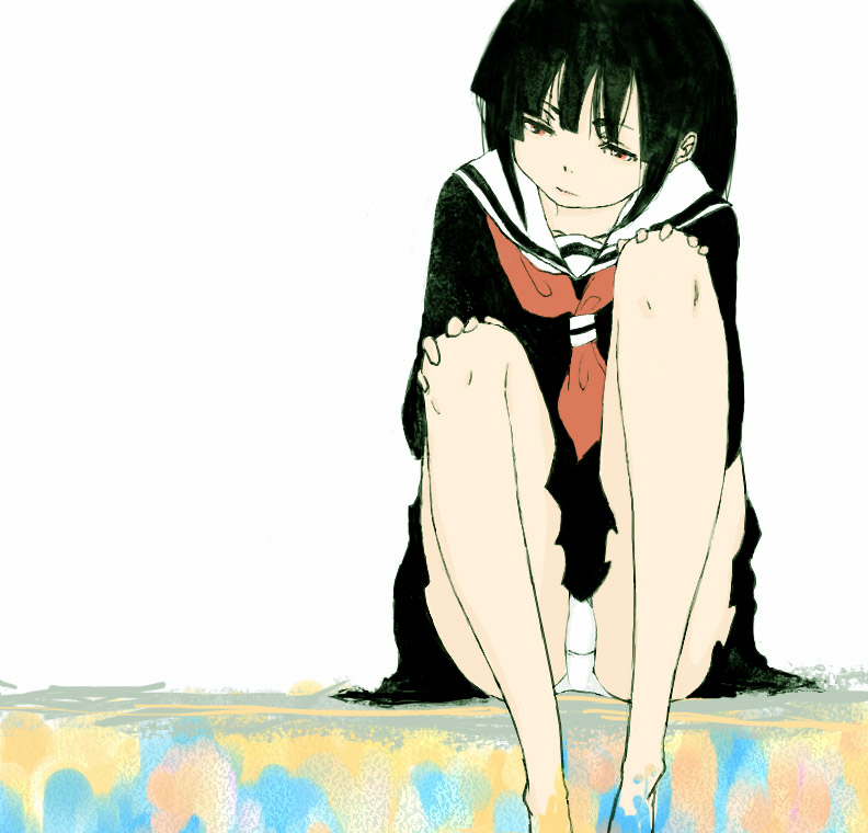 00s1girlbarefootblack hairblack serafukublunt bangsfemale focushime cutpaintpantiesred eyesschool uniformserafukusolounderwear