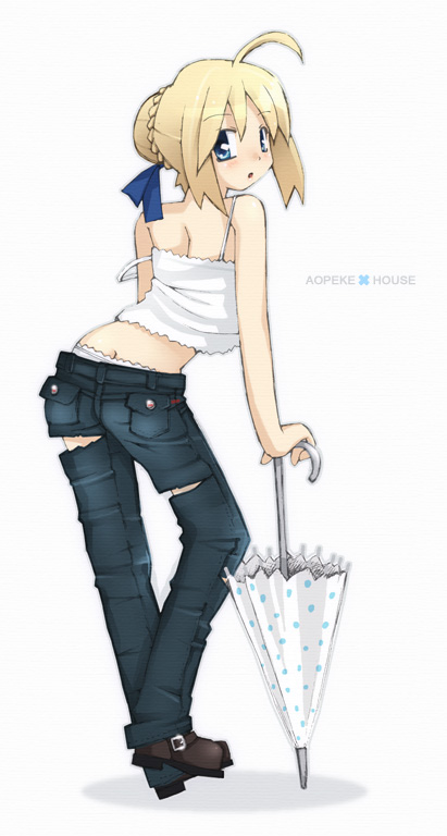 00s1girlahogebare shouldersblonde hairblue eyesbutt crackclosed umbrellafemale focushair ribbonplantedplanted umbrellaribbonsolotorn clothesumbrella