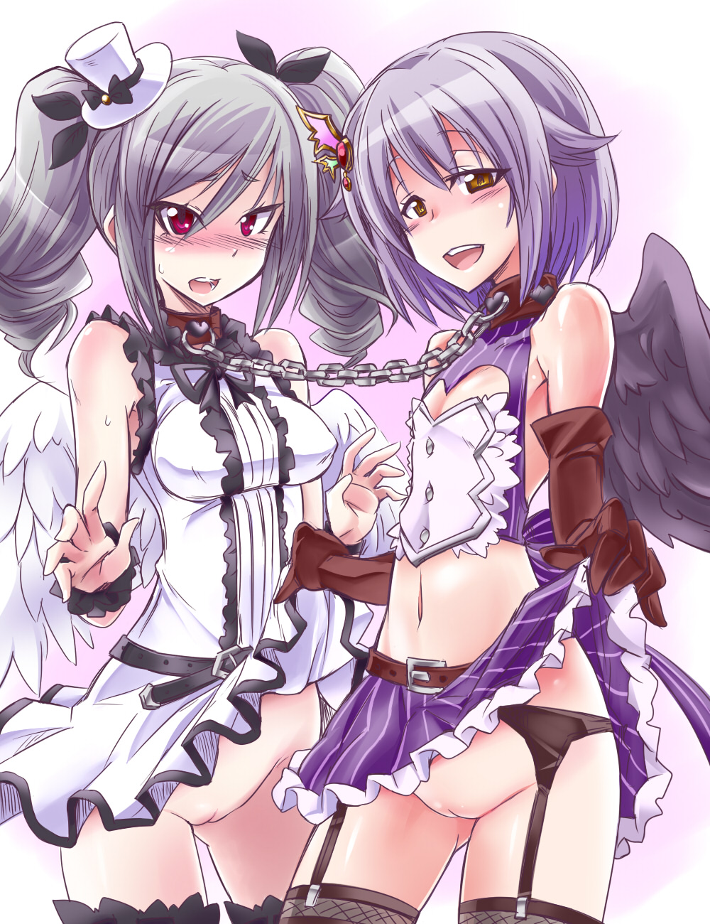beltblack wingsblushbondagebowchainscollardressdress liftelbow glovesfemsubFlag for Deletiongarter beltgarter strapsgloveshair ornamenthathat bowhat ribbonheartlavender hairlinked collarlooking at viewermultiple girlsmultiple subsno pantiespussyred eyesribbonshort hairskirtskirt liftslavethighhighstied hairtwintailsuncensoredwhite wingswingswrist cuffsyellow eyes