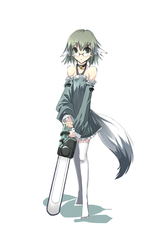 1girlanimal earsbellcat earschainsawchokercollardetached sleevesdog earsdog tailfemale focusglassesgreen eyesgreen hairmatching hair/eyesneck bellsmilesolotailthighhighswhite thighhighs