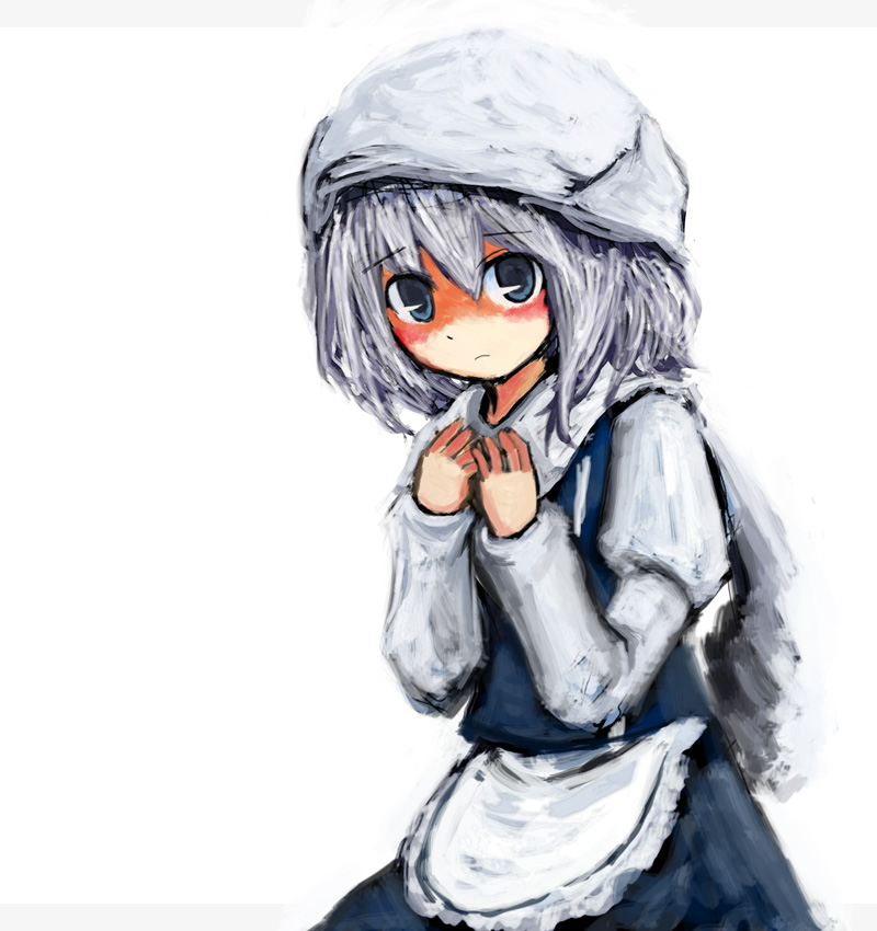 1girlapronblue eyesblushfemale focuslong sleeveslooking at viewersimple backgroundsolowaist apronwhite background