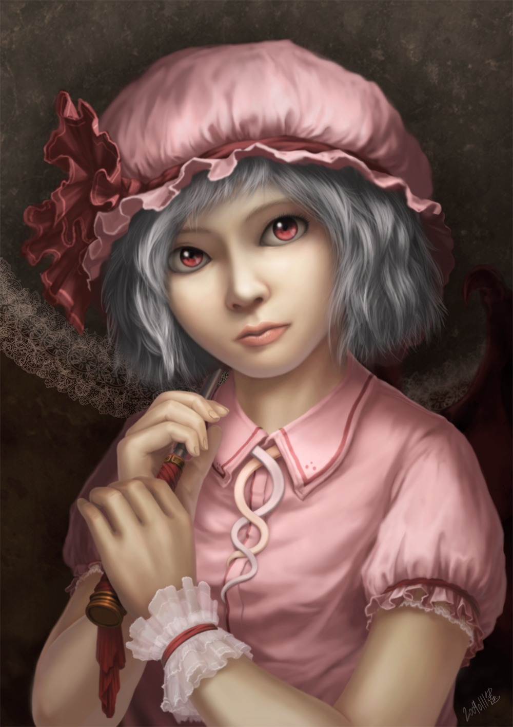 1girldressfemale focushatholdingholding umbrellamob capparasolpink hatrealisticred eyessoloumbrellaupper bodywingswrist cuffs