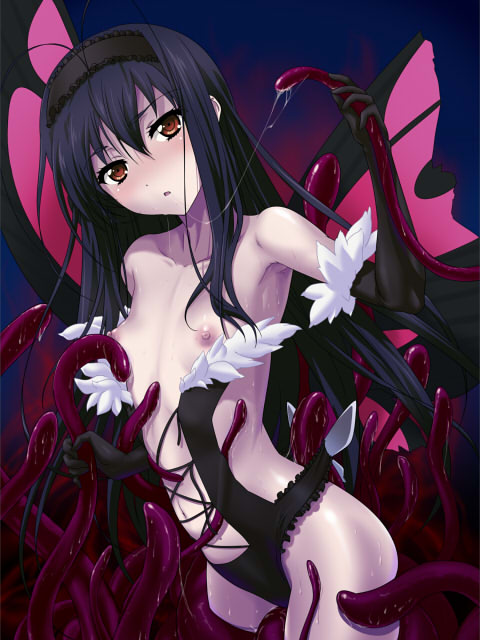 armpitsblack glovesblack hairblushbreastsbrown eyessbutterfly wingselbow glovesFlag for Deletionflat chestgloveshairbandlong hairlooking at viewernipplesopen mouthpantiesshinyshiny skinsolosweattentacleunderwearwings