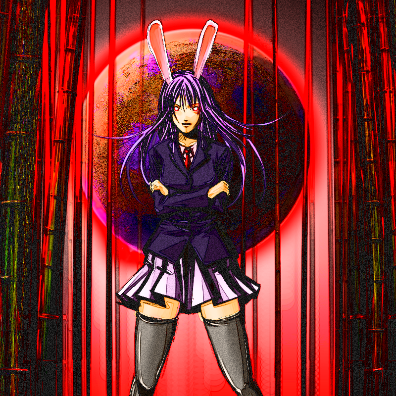 1girlanimal earsbamboobamboo forestfemale focusforestglowingglowing eyesmoonnaturenecktiepleated skirtpurple hairrabbit earsred eyesred moonskirtsolothighhighszettai ryouiki