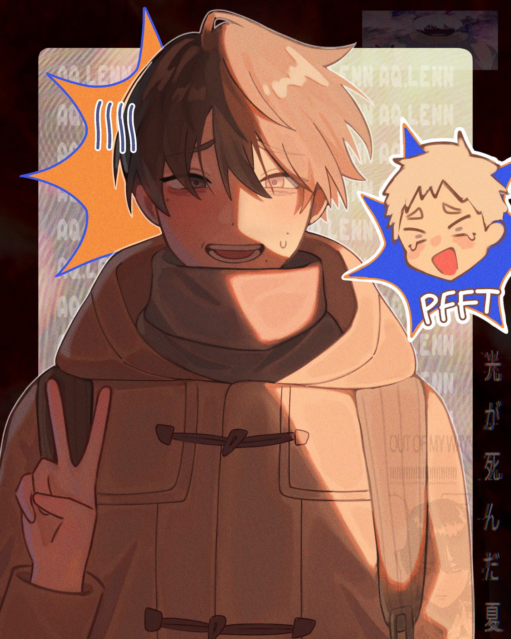 2boysaqlennblack haircoatduffel coathair between eyeslaughinglooking at viewermale focusmolemole on cheekmole under eyemole under mouthmultiple boysmultiple molesnervous smileopen mouthshirtshort hairsmileteethtogglesupper bodyvwhite hairwhite shirtwinter clothes