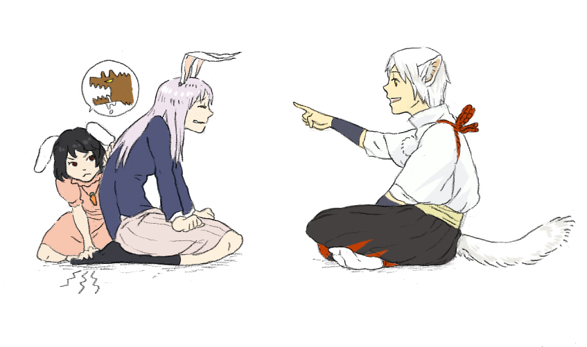 3girlsanimal earsblack hairfemale focusmultiple girlspurple hairrabbit earsred eyesshort hairskirtsockstailwhite hairwolf earswolf tail