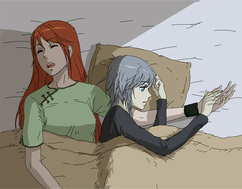 2girlsbedblue eyescasualfemale focuslong hairmorningmultiple girlspillowred hairsleepingunder coverswristbandyuri