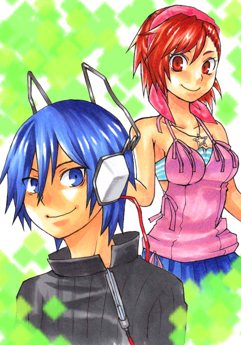 maruki (punchiki), hatsune miku, hiiragi kagami, lucky star, vocaloid, bad id, bad pixiv id, animal ears, aqua hair, blue eyes, cat ears, cosplay, detached sleeves, hatsune miku (cosplay), headphones, long hair, microphone, necktie, skirt, solo, spring onion, thighhighs, twintails, zettai ryouiki