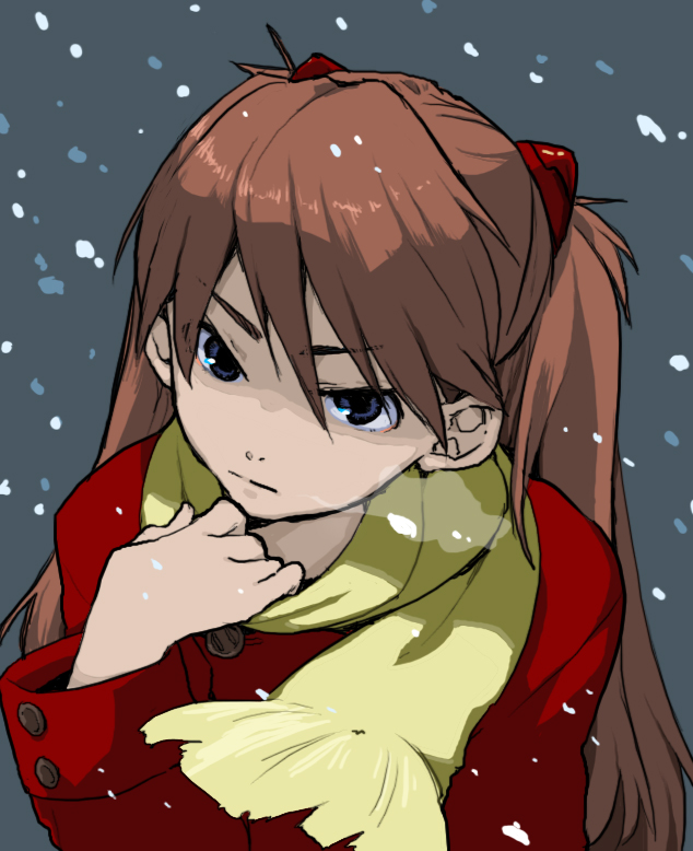 angryblue eyesbrown haircoatfrom abovehair ornamenthaircliplong hairlooking upred hairscarfsnowsolo