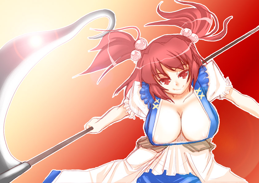 1girlbreastscleavagedressfemale focusgradient backgroundhuge breastsred eyesred hairscythesmilesolotwintailstwo side up