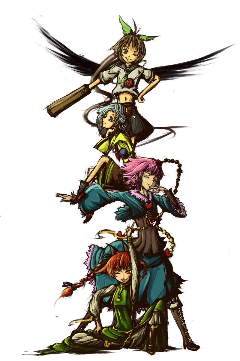 4girlsdressfemale focusfull bodyhuman towerkomeiji koishmultiple girlsnavelschool uniformskirtstacking
