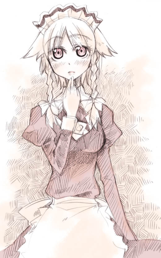 1girlapronblushbowbraidfemale focushair bowhand to own mouthmaidmaid apronmaid headdressmonochromepink themeshort hairsketchsolotwin braidsupper bodywaist apron
