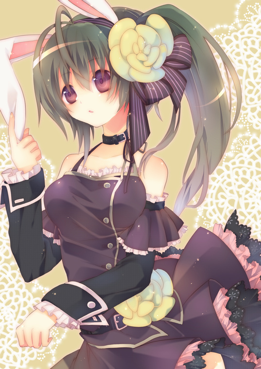 animal earsantenna haircollardetached sleevesdressfrillsgreen hairhair ornamentlong hairrabbit earsside ponytailsolo