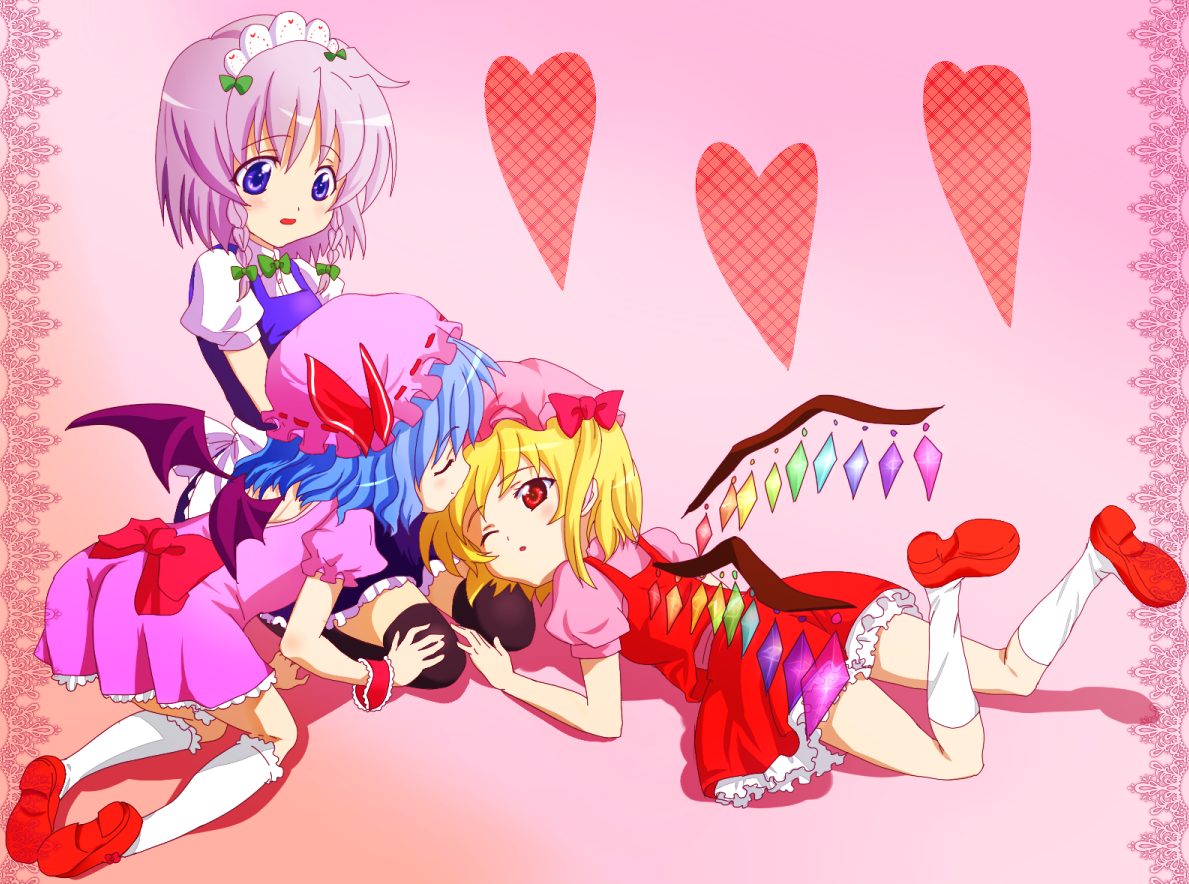 3girlsbat wingsblack thighhighsblonde hairbowcosplayfemale focusfrillsgathershair ribbonhairbandhatlyingmaidmaid headdressmary janesmultiple girlson stomachone eye closedparodyred eyesribbonshoesshort hairthighhighswingswinkwrist cuffs
