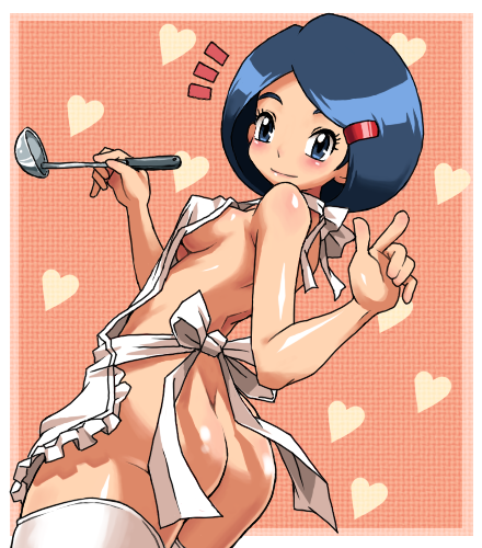 1girlapronassblue eyesblue hairblushbreastsfemale focushearthousewifeindex finger raisedladlelooking at viewerlooking backmatching hair/eyesmature femalemedium breastsnaked apronshort hairsideboobsmilesolothighhighszettai ryouiki