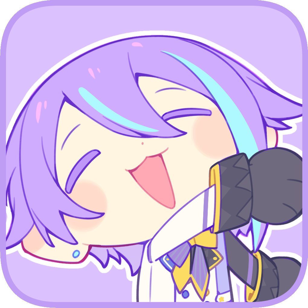 :3arm upblack glovesblue streaksblushchibiclosed eyesdiagonal-striped clothesdiagonal-striped necktieearringsglovesjewelrymulticolored hairmulticolored necktienecktieopen mouthprofile picturepurple backgroundpurple eyespurple hairsingle earringstreaked hairstriped clothestwo-tone hair